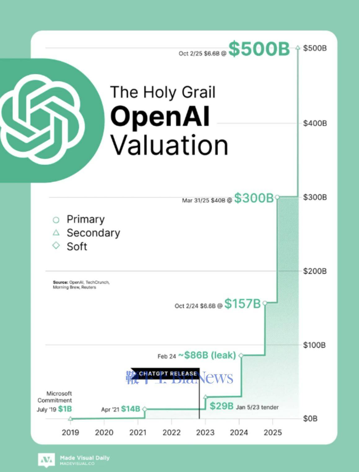 10月4日消息,人工智能巨头 OpenAI 完成员工股份出售交易,公司估值最终定格为 5000 亿美元,正式超越 SpaceX(估值 4000 亿美元),登顶全球估值最高初创企业。